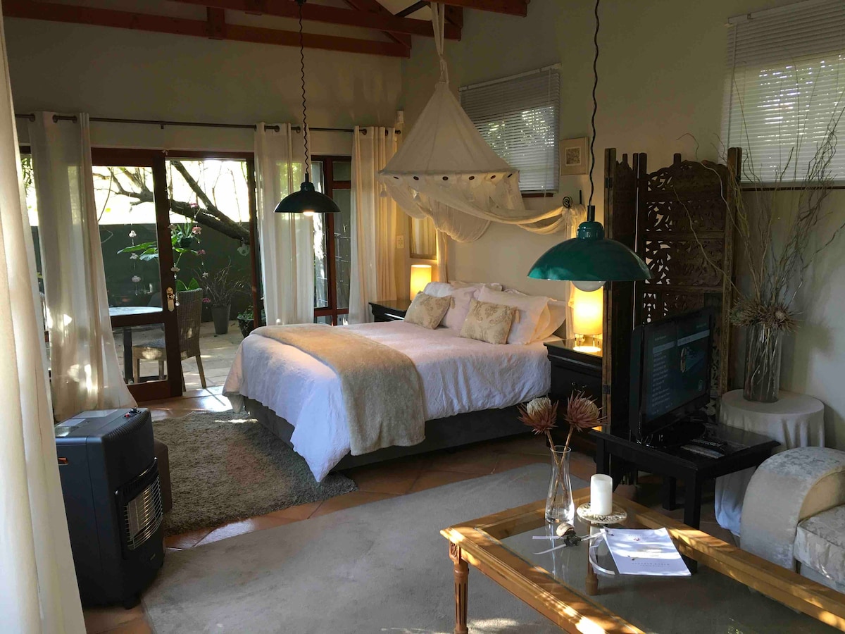 沒有停電!歡迎來到您在樹林中的空間! Wi-Fi、DSTV Premium 和太陽能。 非常適合商務或休閒旅行! 空間明亮、安靜、安全、放鬆且寬敞。 您有自己的入口,房源內有停車位。泳池距離您的門口僅幾步之遙。開放式設計,配有睡眠區、休息室/餐廳、小廚房和獨立浴室。 靠近極佳的購物中心、餐廳和所有主要的約翰內斯堡動脈。距離Sandton CBD 6.5公里。