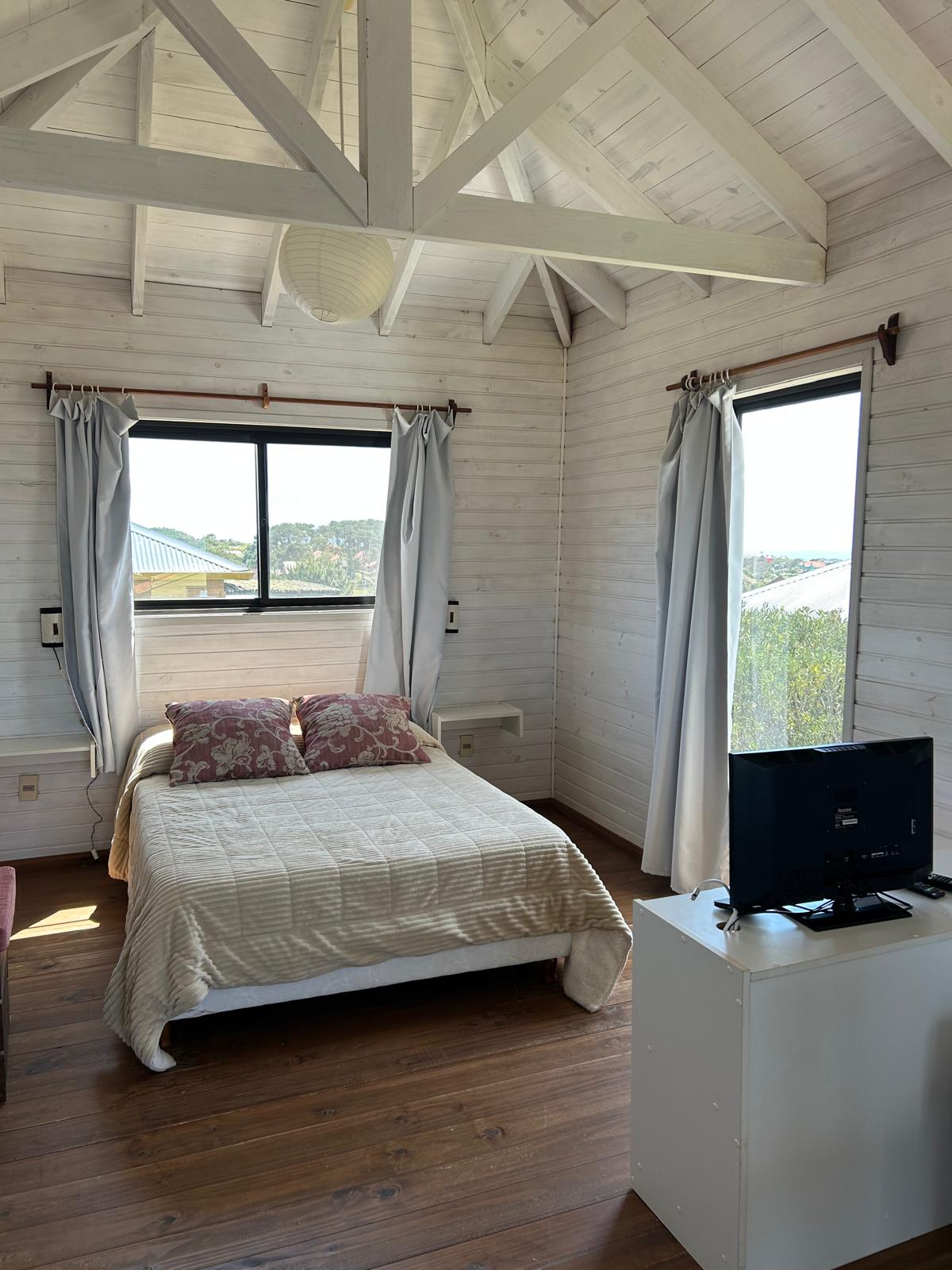 Cabaña de madera a 450 mts de la playa de La Viuda. Para 2 personas. Cocina con equipamiento completo, baño privado , aire acondicionado, wifi, smart TV, deck con parrillero, jardín