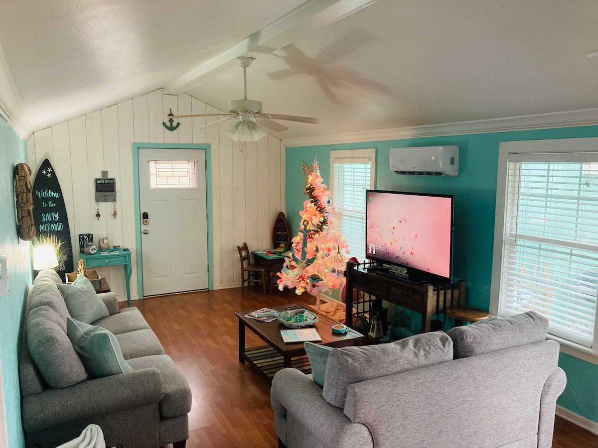 Nestled in Rockport, Texas, just outside the city limits, this 384 sq ft tiny home offers a very compact layout with rooms close together—ideal for guests familiar with tiny home living. Please review photos. Tucked under huge oak trees, it features a fire pit for relaxing after a day at the beach. Though small, it includes full-size amenities: refrigerator, gas range, dishwasher, queen beds, and a spacious shower! *Rates include hotel & venue tax imposed by the city.