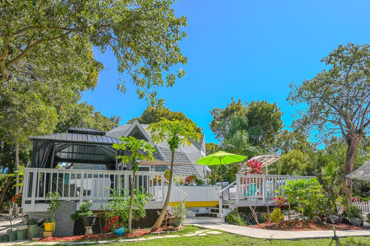 Artisan styke octagon house nestled beneath lush tropical trees, mangos, bananas, dragon fruit, guava, papayas and more in a private, fenced yard . Guests enjoy full access to the patio, colorful gazebo, endless flowers and orchids, meditation garden, screened lounge, garden paths, and hammock. Enjoy sunrises and sunset over our local Restaurant and Boat Marina across the street. Community park with Pickleball Courts and Exercise Paths.