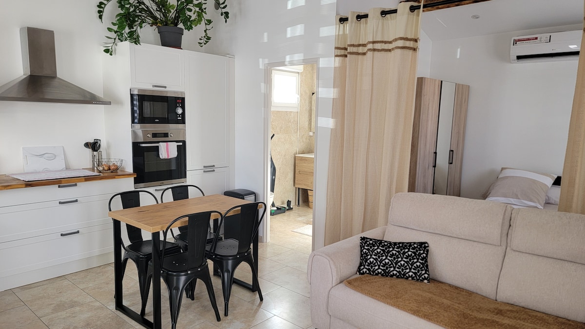 位於羅尼亞克市中心,迷人的獨立單間公寓,面積26平方米,最多可容納4人。小花園,配有桌椅。街上停車很方便。這套單間公寓非常適合有或沒有孩子的情侶、獨遊旅客或商務旅客。 單間公寓設備齊全,配有一張雙人床和一張沙發床。 可反轉的空調。 距離單間公寓不到 100 公尺的大型免費停車場。 距離馬賽普羅旺斯機場 8 分鐘。 距離艾克斯高速火車站 13 分鐘。
