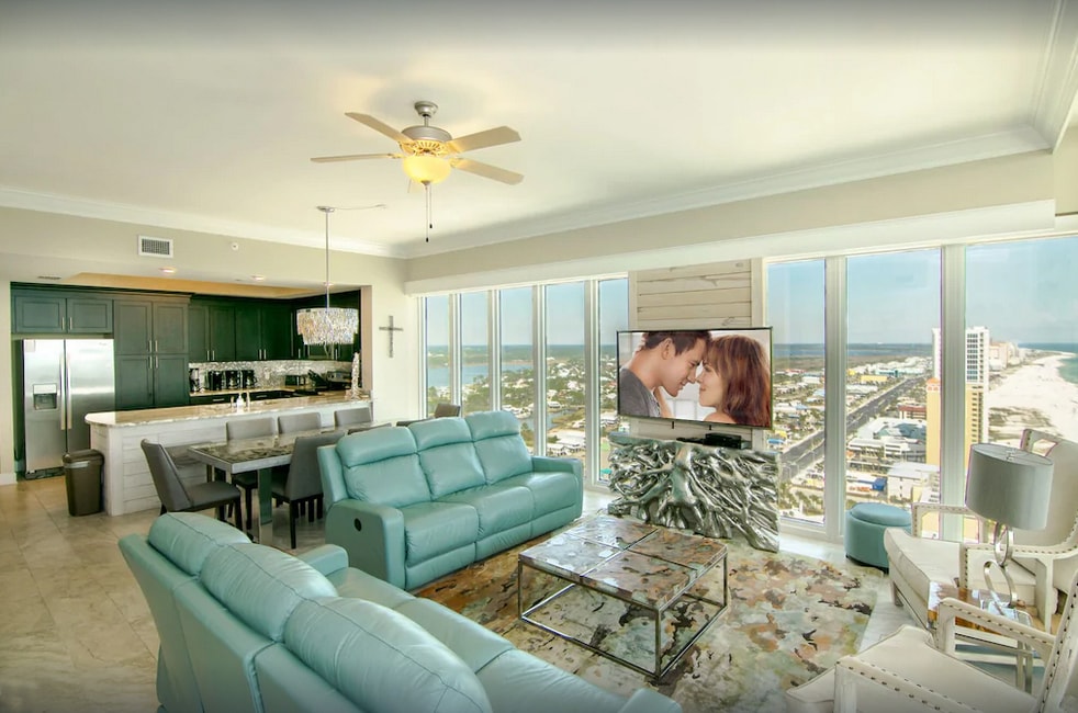 Enjoy a stylish stay at this coastal condo. This newly built getaway is front & center on the white sugar sand beach. Featuring a master bedroom w/ plush king bed & a bunk room w/ comfy queen over queen bunk beds. Retro furnishings & modern decor give a vacation vibe while the location can't be beat. Walk to the Hangout, Pier 33, shopping & many other favorite local spots. This low density building means less people on the beach out front & more space for you!