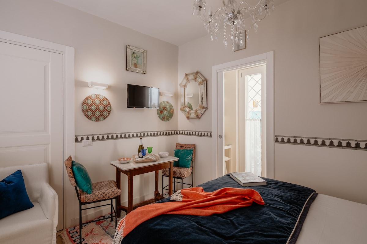 Saturno is an independent suite, recently renovated. It consists of a bedroom, a living room and a private bathroom. It can accommodate up to 4 people. It's equipped with a double bed, double sofa bed, kitchenette, fridge, table, wardrobe, hair dryer and other accessories that make it unique and comfortable. Our guests enjoy the typical services that characterize self-contained Bed and Breakfast structures. A first supply of food and beverages for breakfast is included in the price.