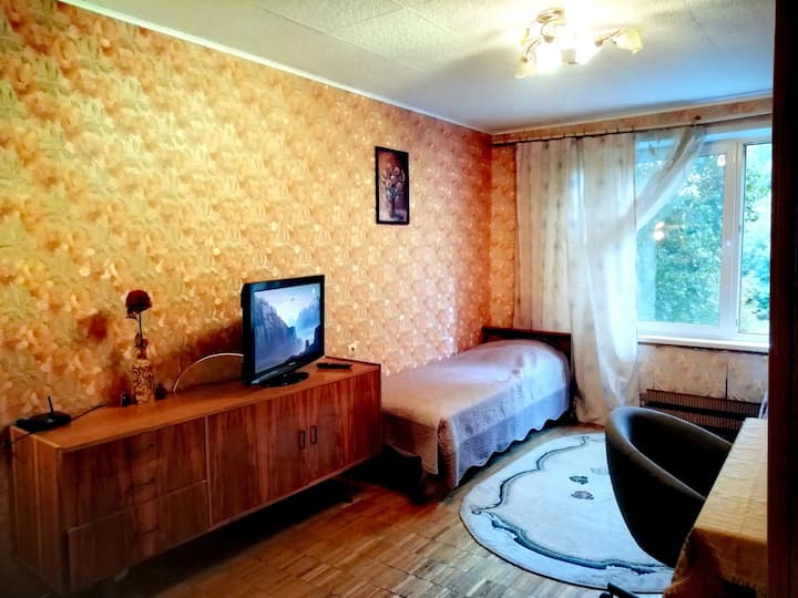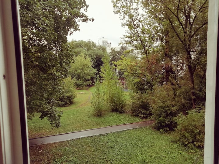 Quiet and cozy apartment in 15 min walk from the m River Station, near the park and good shops, many parking lots, house panel, 2nd floor, there is an elevator, windows to the courtyard, many trees, can not hear the noise of streets. The area is 33 meters, a good TV and everything you need. Clean, a bit old-fashioned. The interior is decorated with original paintings. New windows, wallpaper and painting walls, clean plumbing and so on.
