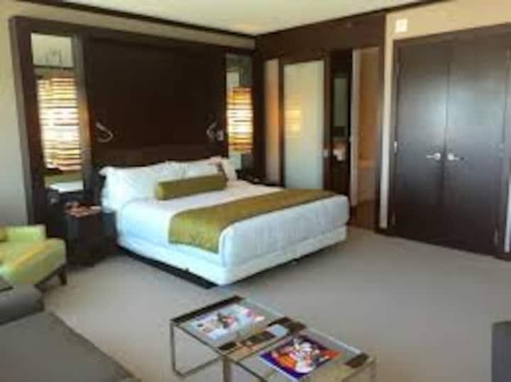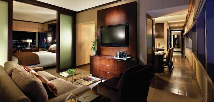 Luxurious suite at the Vdara with beautiful views is located on the strip and less than 10 minutes away from the Convention Center. The tower is connected to the Bellagio, walking distance from the T-Mobile Arena, all major casinos and Monorail station. Free WiFi. Kitchenette and large bathroom and living room with pullout queen-size sofa bed with spa-style soaking tub & walk in shower. You are entitled to use all resort amenities, swimming pool, hot tub, gym, business center for free.