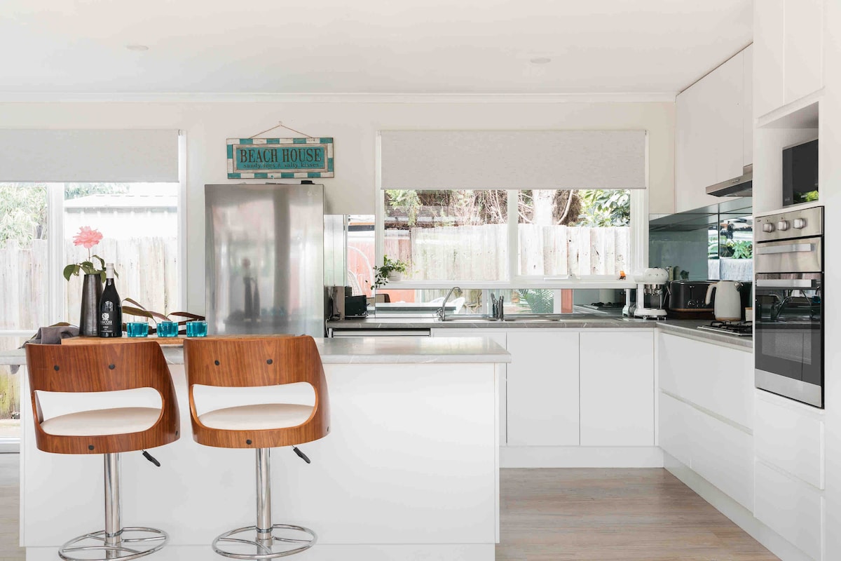 We offer a modern, private, two bedroom guesthouse to accommodate 4 guests. The Guesthouse is attached to the rear of our property. It is safe, private, and unique. You'll be close to some of the best wineries, restaurants, cafes, the famous Peninsula Hot Springs, and Alba Springs, as we are situated in the heart of the Peninsula. STRICTLY - NO PARTIES - NO SCHOOLIES