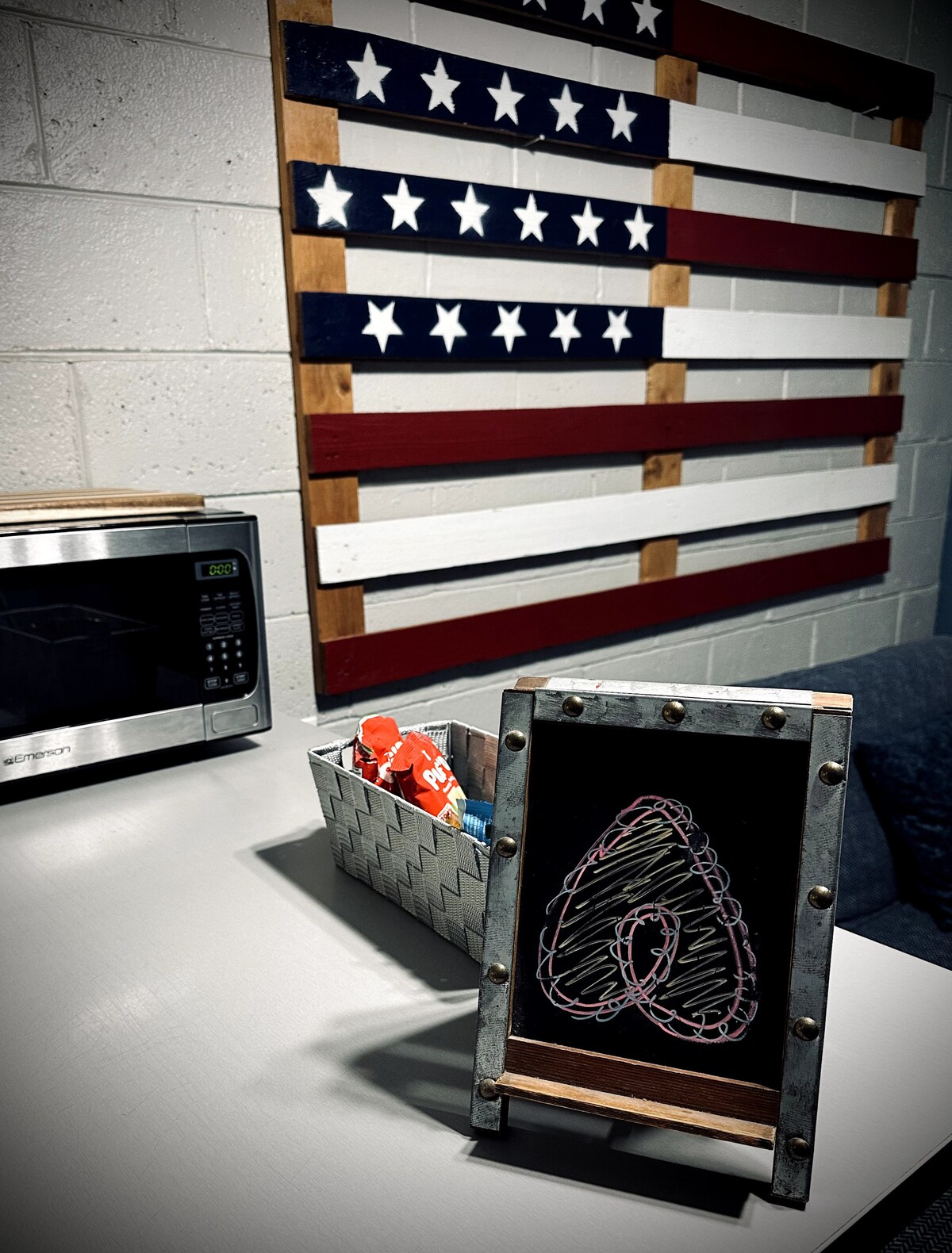 The Pallet Studio in East Sac is a quiet and cozy 1 Bedroom/Studio in one of the most beautiful neighborhoods in Sacramento. This fully furnished, custom-crafted studio has a unique and eclectic style. Re-purposed pallets are used throughout the studio, from accent walls to homemade art work. There is a kitchenette with a microwave, mini-fridge, toaster and hotplate, and general kitchen supplies. Air conditioning is cold, heater is hot!