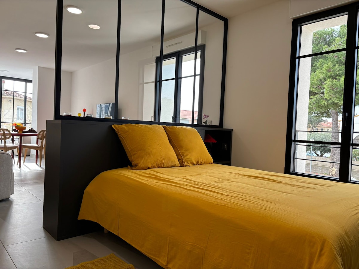 40 平方公尺的獨立別墅一樓,配有花園和烤肉設備。 與屋主無需面對面交流。 安靜的住宅區,步行 7 分鐘即可抵達巨大的沙灘,步行 10 分鐘即可抵達卡內普拉格 (Canet Plage) 市中心。 - 帶落地窗的客廳和 2 人沙發床(含 NetFlix 電視和 WiFi) - 小臥室,配有雙人床 - 設備齊全的廚房 - 帶淋浴和洗衣機的浴室 - 獨立廁所 -花園配有桌子、躺椅、烤肉和停車位 提供床單和毛巾