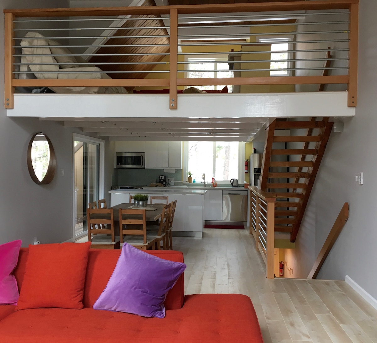 Modern Mountain Retreat Upper Unit is the entire top floor (1600 sq ft) of a 2-story home, completely separate from bottom floor, your own private entrance through front door. *Price includes tax. 2 bedrooms, 2 bathrooms, fireplace, dry sauna, jet tub, fully furnished, central heating, washer/dryer, dishwasher, large deck, lake views from living room, kitchen, deck. 400 Mbps WiFi! Private beach access 5 minutes drive away. Nearby trails hiking, biking. Antibacterial products used in cleaning.