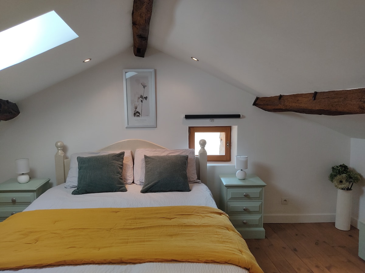 Vous logerez dans l'agrandissement de notre maison de campagne. Vous trouverez tout ce qu'il vous faut pour passer un séjour au calme. Logement spacieux avec une cuisine, une salle de bain avec douche à l'italienne, un couchage clic-clac en bas idéal pour les enfants et une chambre en mezzanine non fermée à l'étage. Enfin vous profiterez d'une magnifique vue dans le salon avec également un accès terrasse.