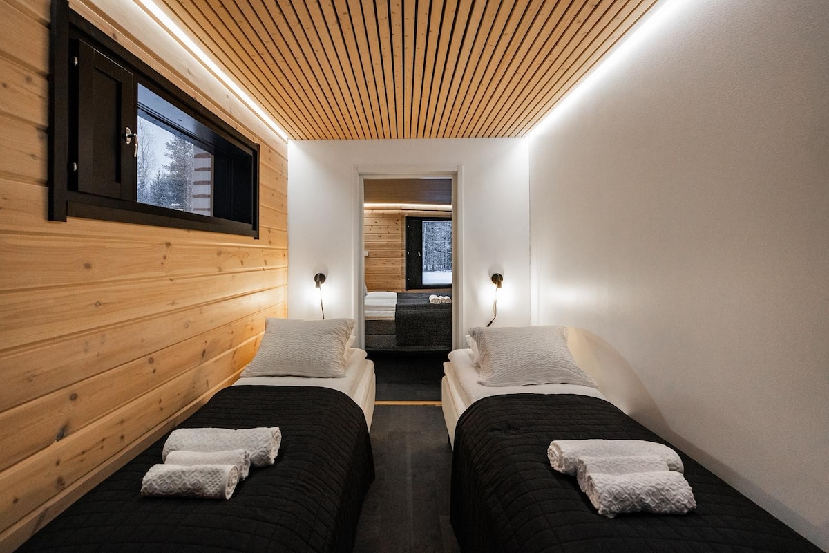 Sonka Resort’s Mirror Houses are set by a frozen lake, surrounded by forest and open sky. Each cabin has a mirrored exterior for privacy, a lake-view glass wall, double bed, sofa bed, kitchenette, bathroom, Wi-Fi, and a projector screen. Local breakfast is available on request with at least three days’ notice. With several BBQ kotas on the premises, guests can enjoy outdoor cooking anytime. Igloo saunas and hot tubs are available to book. A quiet Lapland escape under the northern lights.
