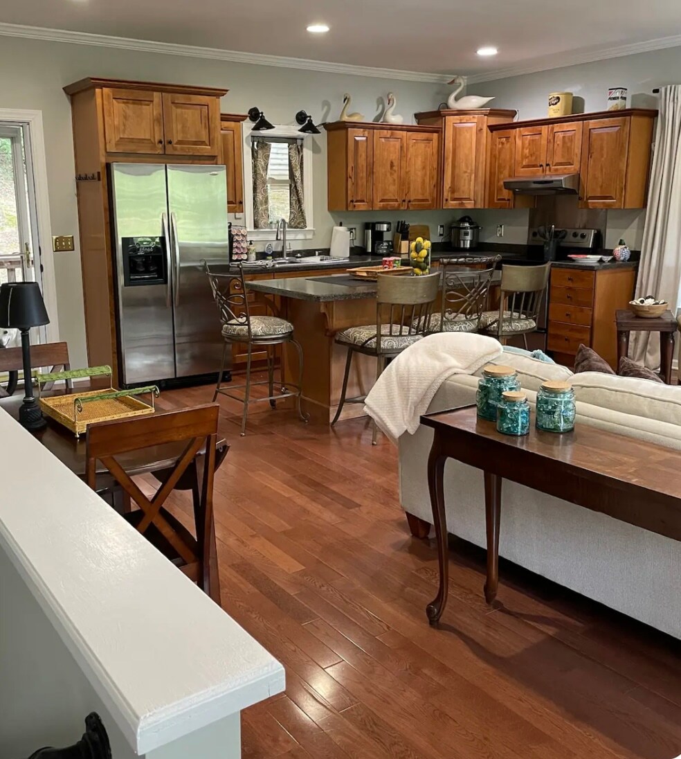 美麗、專業設計和全新翻修的房源。這間小屋距離High Rock Lake僅兩英里,距離列克星敦市中心僅11英里,前往夏洛特、High Point、Winston-Salem和北卡羅萊納州格林斯伯勒很方便。房源的亮點包括按摩浴池、開放式廚房和用餐區、配有壁爐和圖書館牆的客廳、配有雙淋浴頭的豪華瓷磚淋浴間、遮蔭門廊、配有家具的戶外用餐空間、火坑區域和充足的街外停車位。