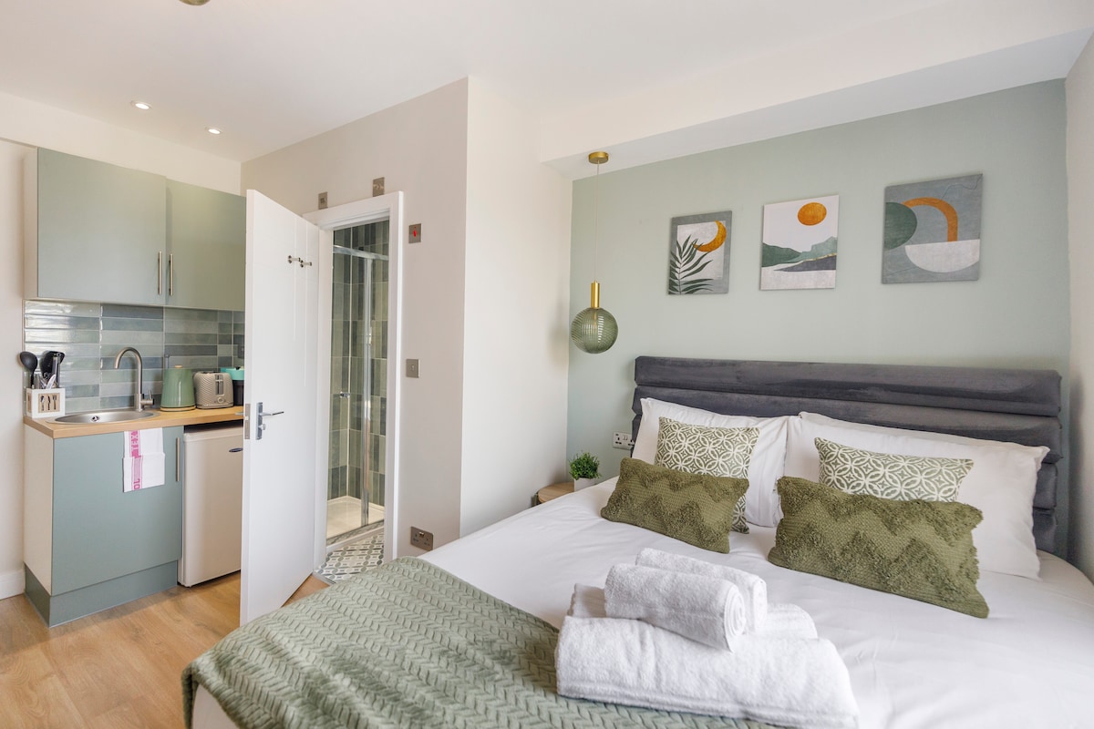 我們的俱樂部公寓位於整棟房子內,配有一張英國加大雙人牀(美國標準雙人牀)、設備齊全的小廚房、開放式休息/用餐區域、大衣櫃、書桌、套房淋浴間、Wi-Fi和空調。 招牌室內設計採用精緻的藍綠色、勃艮第或深綠色調色調,分層搭配天鵝絨、粗糙的植物印花,配有美麗的裝飾螢幕,將起居區域與臥室隔開。 可睡2人英國|英國加大雙人牀| 23 - 27平方公尺