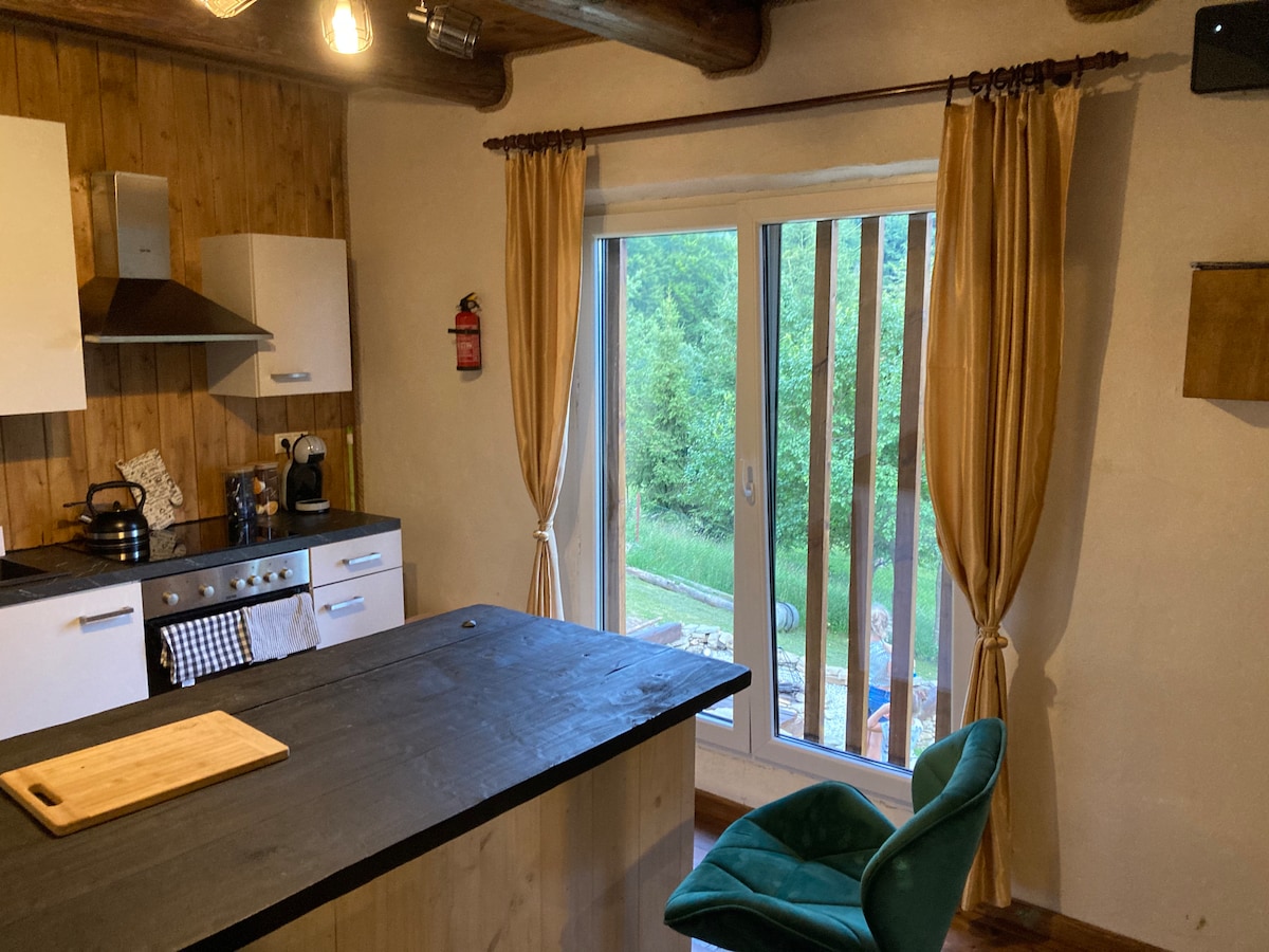 Our wooden cabin is situated between two rivers. So it is a wonderfull and very peacefull place to stay. Downstair, there is a main room, with modern kitchen, fridge, washing machine, diswasher machine... there is a fireplace, that can heat whole cabin. The large terace is great place where you can enjoy your cup of tea or coffee. the garden and surounding is a really great place for kids. and if the weather will be bad, thay will maybe happy from swing low in the cabin... :-)