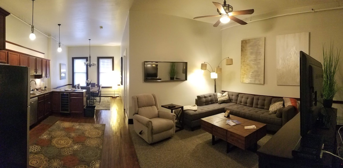 This is one of the nicest units I rent. The space is in an historic renovated building in downtown Fair Haven, VT. The space was originally used to manufacture shirts. I have divided the 1600 square feet into a two bedroom loft. It has very high ceiling and windows. It is very spacious and has been completed updated. The loft has it's own kitchen (not shared) and it's own lock and key. Since it is on the third floor of the building, it is very quiet and secure.