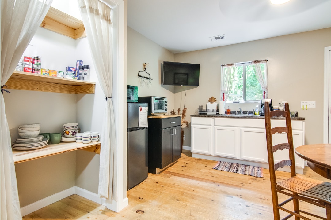 農舍裝飾,坐落在鄉村環境中,坐落在我們的房源邊緣,俯瞰成熟的硬木森林。從回收的穀倉木材設計到定制的固定裝置,空間有很多獨特的觸感。整個地方的木地板和天花板讓房源溫馨舒適,讓您放鬆身心。如果您願意,大型窗戶可讓充足的自然光線進入空間。大門廊遮蔭的門廊可供放鬆。火坑就在門廊外。Starlink WifI提醒此房源不允許12歲以下兒童入住。
