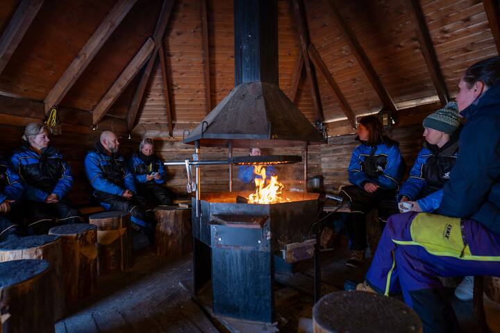 在拉普蘭小屋的營火旁享用傳統晚餐