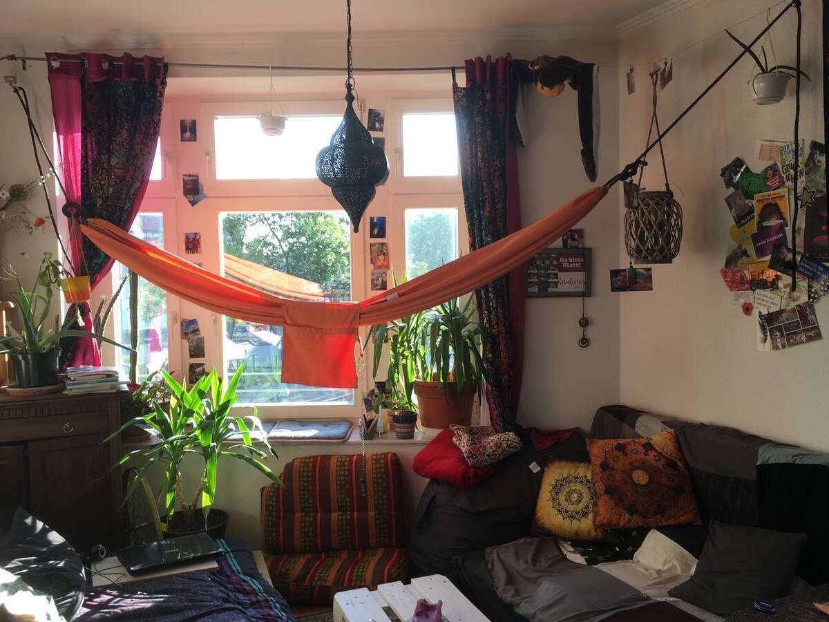 可愛的兩房公寓,有很多光線、日落景觀和窗外的綠色景觀。 整潔的裝飾,充滿活力和色彩繽紛的復古家具,讓它成為一個舒適時尚的住宿地點。 位於Karl-Heine-Straße拐角處的一條平靜街道上,有很多酒吧、餐廳和咖啡廳可供選擇。 步行即可抵達藝術畫廊、電影院和劇院(請參閱我的指南手冊)。 靠近一切,步行3分鐘即可搭乘公共交通工具。