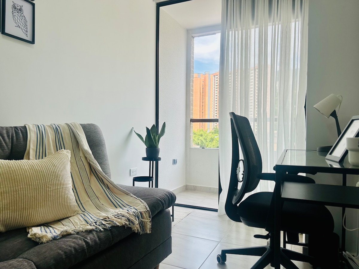 迷人的頂層公寓,設計清新舒適,位於一棟10層建築的頂部,擁有豐富的自然光線和隱私。 步行5分鐘即可抵達Sabaneta地鐵站,從那裡步行10分鐘即可抵達Poblado站,或步行20分鐘即可抵達麥德林市中心的聖安東尼奧站。 這個街區充滿活力,步行即可找到步行幾分鐘即可找到您可能需要的所有零售、雜貨和服務。 56平方公尺1間臥室/1間浴室