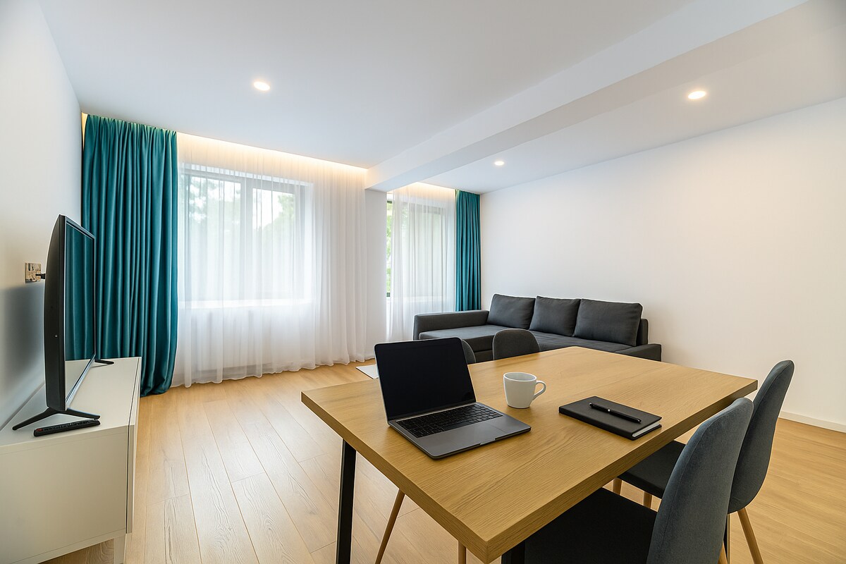 Enjoy a higher-level stay at Apart B&V 701, where panoramic mountain views and designer interiors set the mood for total relaxation. The calm, elegant space is perfect for unwinding or working in comfort. Located in Coresi Avantgarden, it’s a great base for couples, families, or business guests seeking style and serenity.