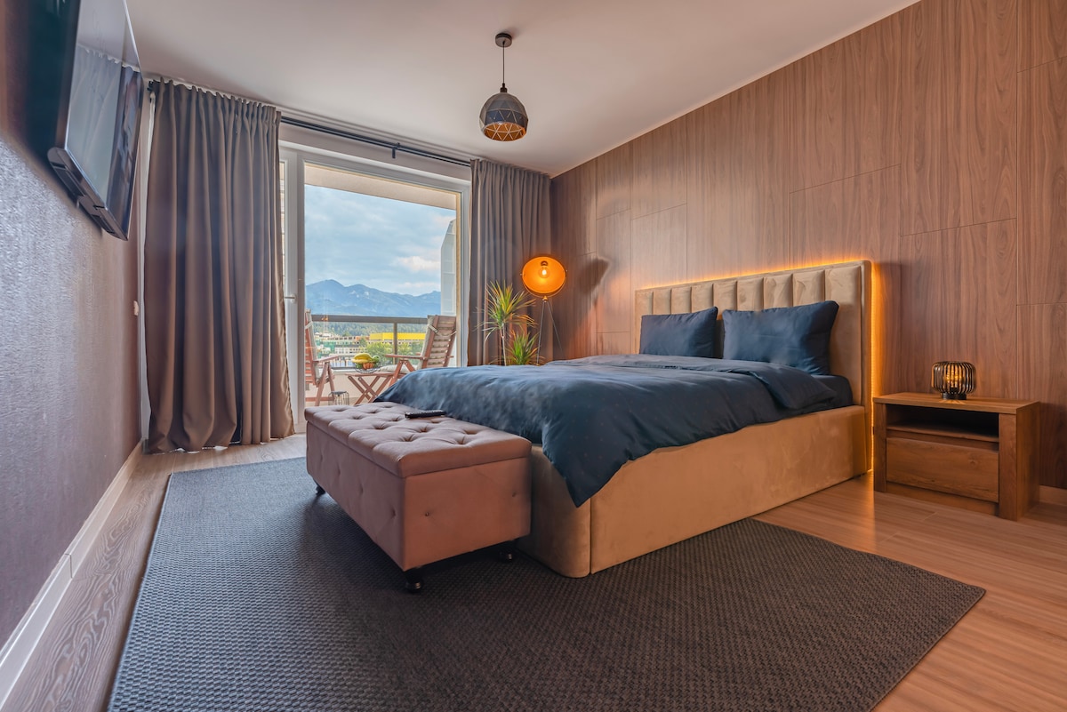 Welcome to Mountain Retreat apartment, located in the residential park Urban Plaza, at a convenient distance from the city center. You will definitely enjoy the stylish décor and attention to detail that come together to create a warm and inviting atmosphere. As soon as you step inside, you'll notice the wood accents and stylish furnishings that create a cozy and welcoming space. The living room is the perfect place to relax and unwind with a fireplace as the centerpiece of the space.