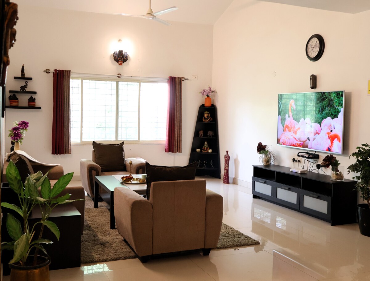 Welcome to our brand new, spacious 2-BHK apartment, ideal for families and couples seeking comfort and convenience. The bedrooms have king / queen size beds with soft orthopedic mattresses for a restful night's sleep. Relax in the large living room with a 43-inch Smart TV, lightning-fast WiFi and a dedicated dining area. Comes with two super clean bathrooms stocked with bath essentials. The fully equipped kitchen includes high-quality appliances and crockery for your culinary adventures.