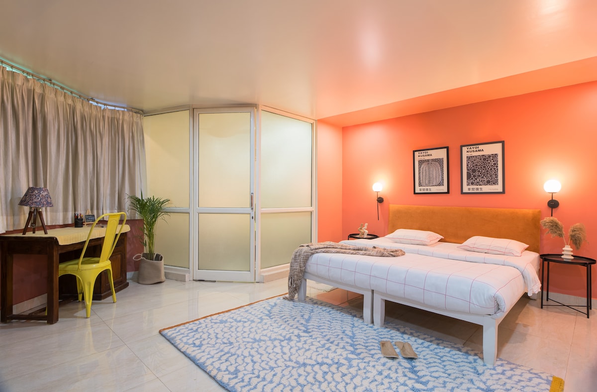 Noir是GK 1的一間臥室住宅,設計有深色調色板和乾淨的線條。 一張特大床,配有套房浴缸,是私人空間的重點,而客廳區域則通往陽臺和一台55英寸智慧電視,採用鉸鏈支架。 設備齊全的廚房,配有內置早餐櫃檯,可供長期住宿。 臥室有自己的42英寸電視和私人陽臺。 兩間房間都有分體式空調、備用逆變器和200 Mbps Wi-Fi,讓您工作和休息都能順暢無礙。 通往二樓的樓梯。