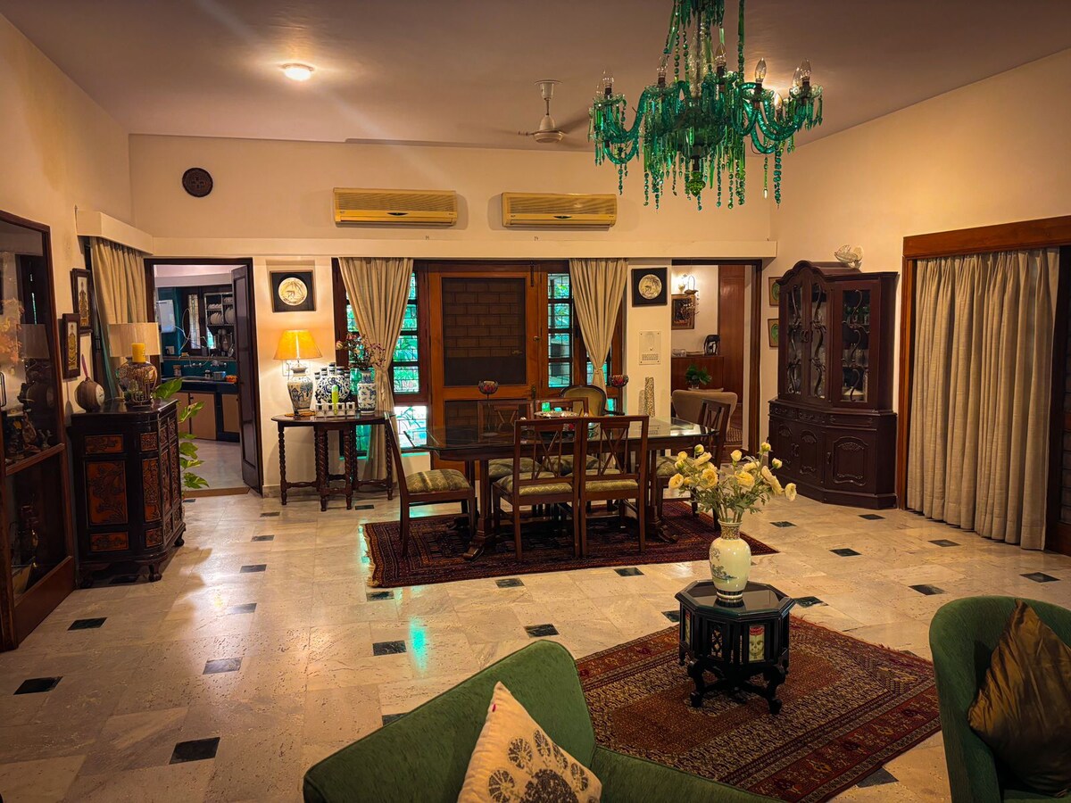 Do you want to bond with family, friends or colleagues in the lap of nature in New Delhi? Do you wish to experience the ideal blend of old-world charm and hospitality with all modern amenities? Do you desire to take a stroll in sprawling lawns under fruit trees or lie in wait for peacocks? If YES then this independent 3-bedroom apartment of Shiv Niwas villa, with private balconies & roof terrace, smart locks, property-wide high-speed Wi-Fi, free car parking & caring lady caretaker-cooks BECKONS!