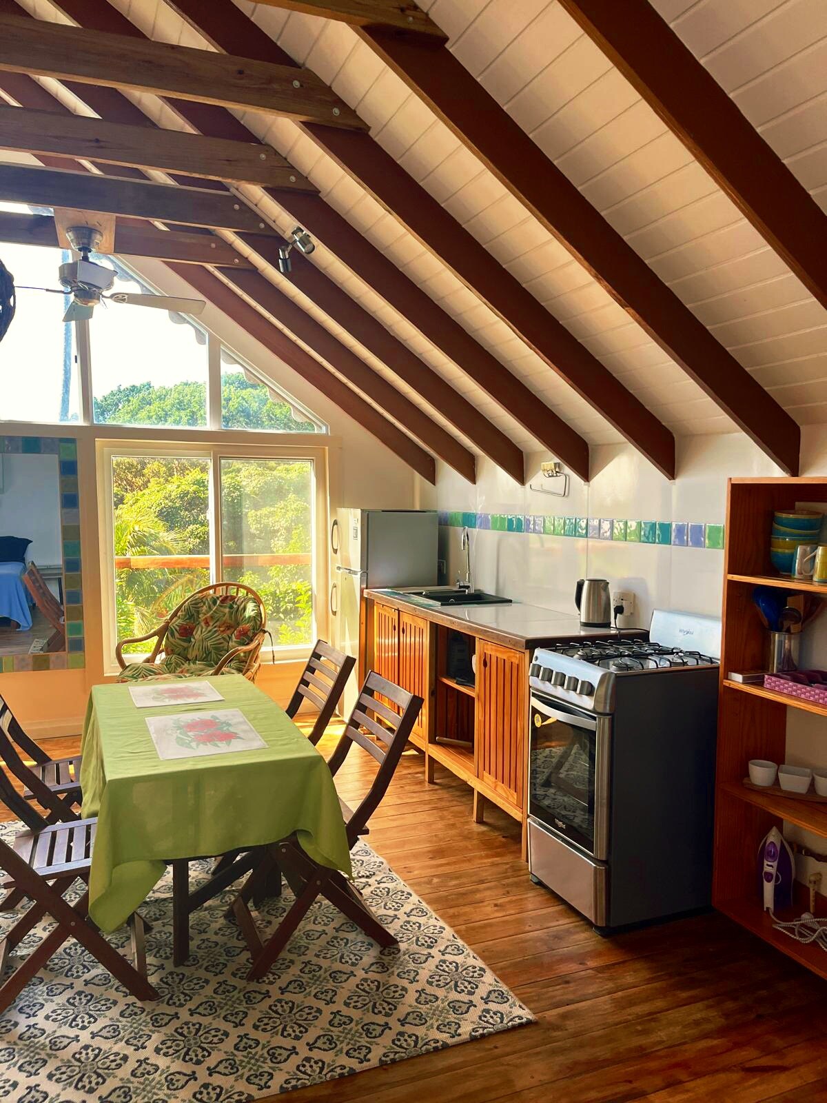 Perched high on the hillside and surrounded by fruit and spice trees, this light and breezy loft invites you to slow down and reconnect. Natural light, cooling breezes, and sweeping views of green hills and the distant ocean create a serene, intimate escape. The loft features a soothing rain shower, a fully equipped kitchen, and thoughtfully designed comforts that blend simplicity with quiet luxury. Perfect for couples seeking peace, romance, and a retreat in harmony with nature.
