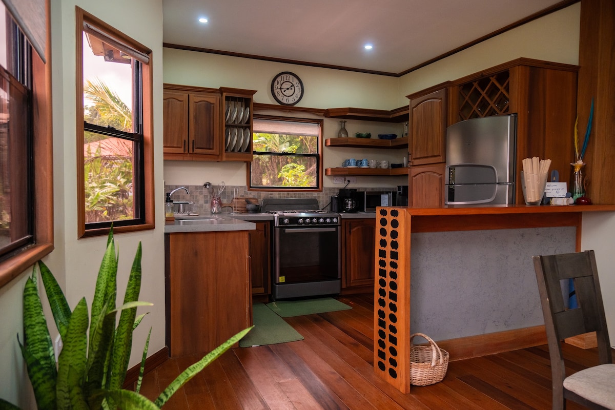 Make some memories at this unique and family-friendly place nestled on a gentle hill between the mountain and the sea. Come relax and enjoy the fresh sea breeze and serene views. From the front deck, you can bask in the sun all day long and enjoy the moonlight and starry sky at nights. Savor the aroma of lush green vegetation and the melodious singing of the birds every morning. This hidden gem offers a short hike to the beach and river, where you can enjoy the beauty of the countryside.