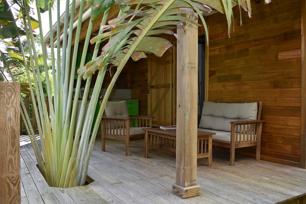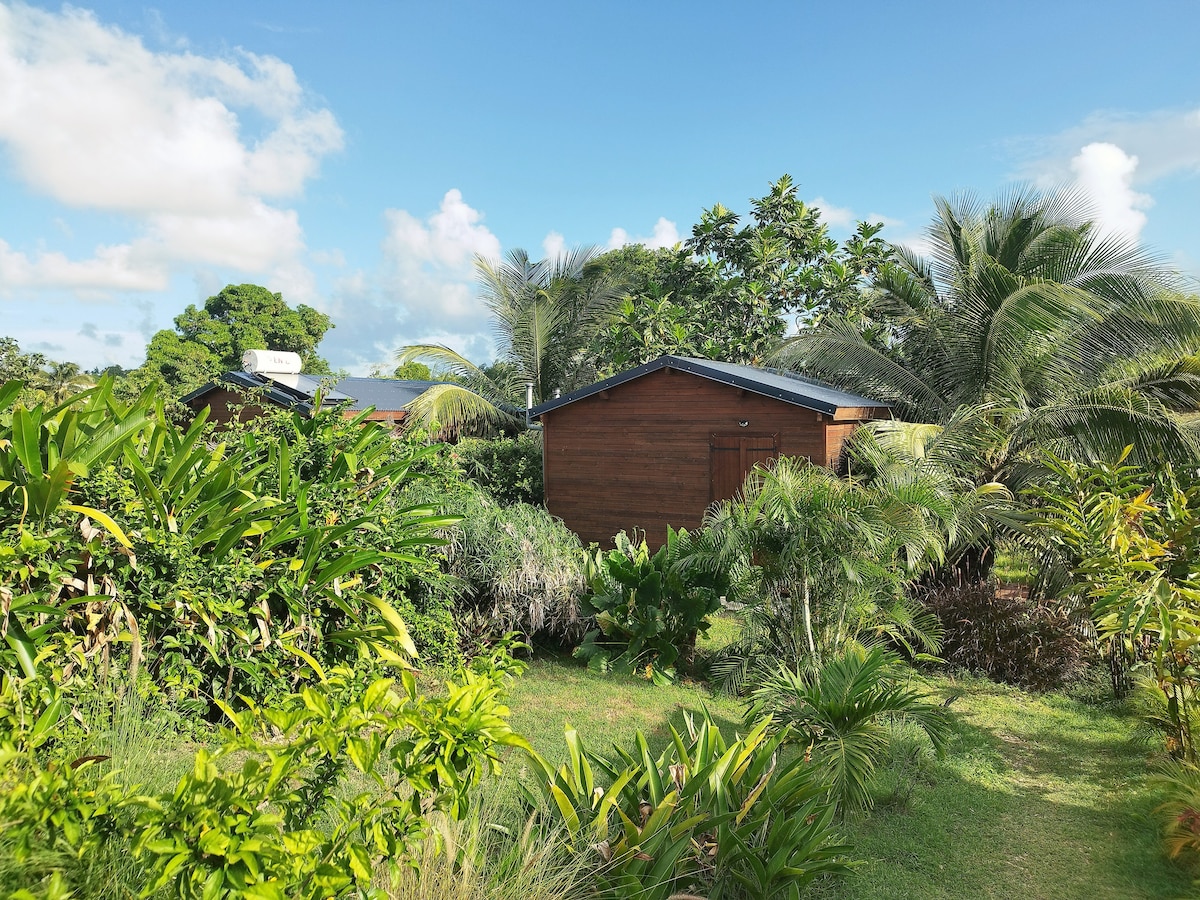 Charmant bungalow en bois, classé 3 étoiles ( pour 2 personnes mais pouvant accueillir jusqu'à 4 personnes) situé à proximité immédiate du bord de mer et de ses plages. Il a été construit dans l'esprit "cabane" et il se situe dans un endroit bien ventilé à l'entrée de notre jardin. Vous profiterez au réveil du lever de soleil sur la terrasse. Au coucher, vous serez enivrer par le parfum d'Ylang Ylang et bercer par le chant des grenouilles.