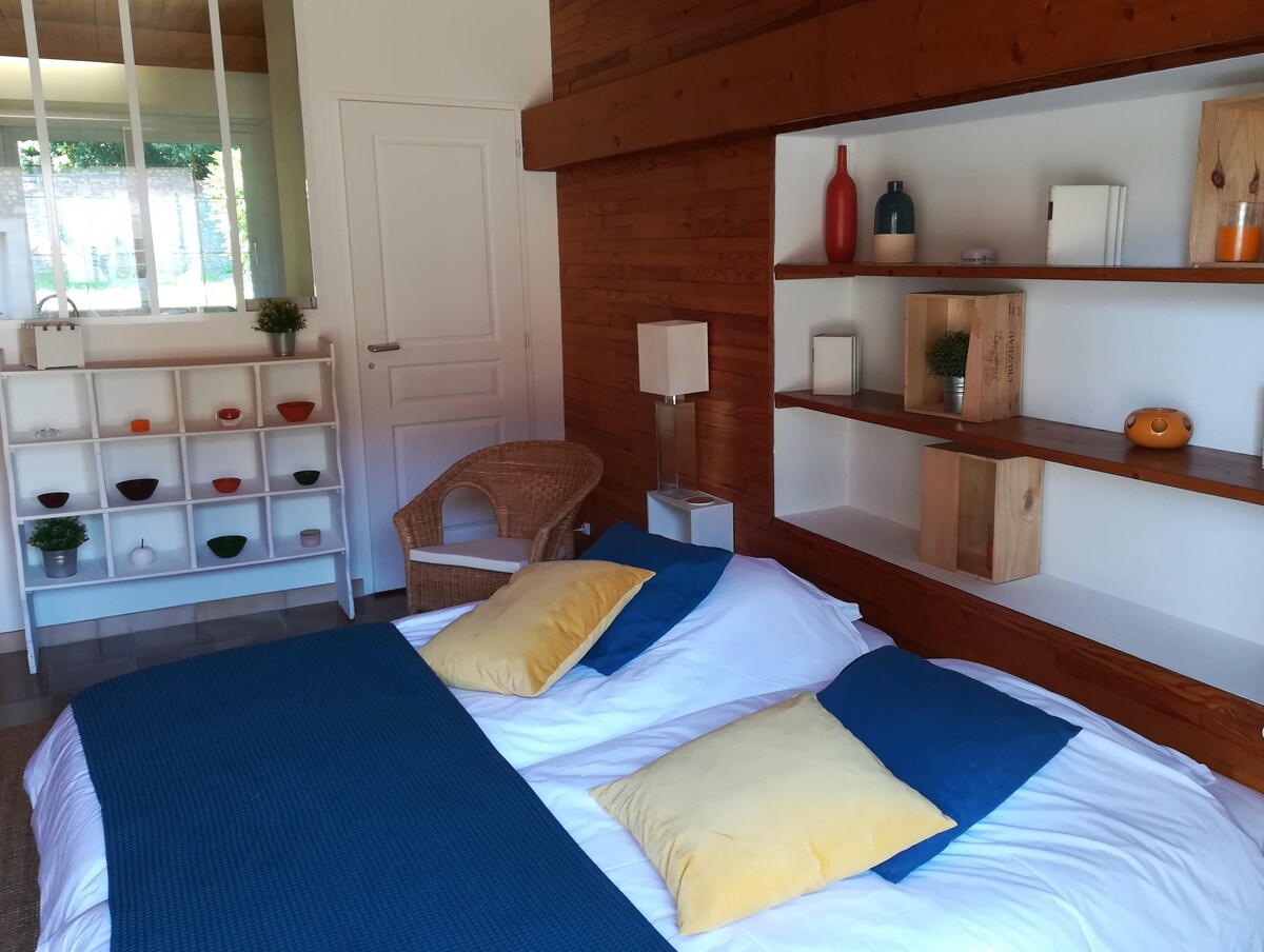 Une halte, à l'orée de la Sologne proche de la Loire et de ses châteaux, profitez d'un espace paisible arboré et aménagé, proche centre ville historique d'Orléans. Un séjour à votre rythme (cuisine équipée). Parfait pour couples, voyageurs en solo, voyageurs d'affaires, couple avec enfants (Lit parapluie sur demande). Grand Jardin, plan d'eau à 5mn, bord de Loire à 10mn. Sortie Orléans Centre autoroute A10/A71 à 5 mn ( pas de nuisance sonore).