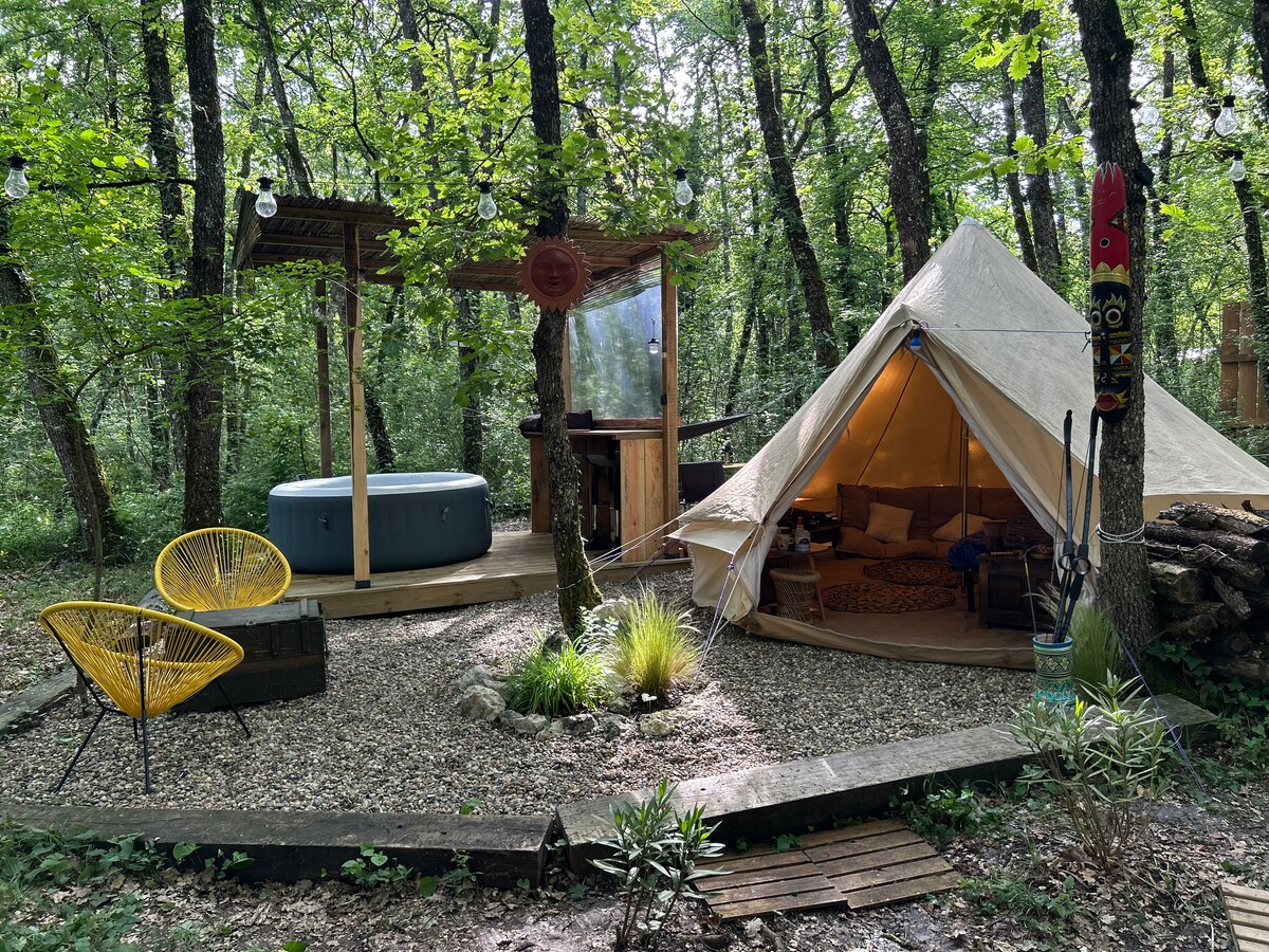 Tipi Apache équipé avec Jacuzzi privatif situé au milieu d'une forêt de chênes. Venez profitez en pleine nature d’une escapade à deux et vivez dans cet hébergement atypique une expérience apaisante et loin du stress quotidien. Plusieurs chemins de randonnées vous permettrons de découvrir nos paysages vallonnés à deux pas. Lit fait, linge de toilette fourni, douche solaire, Climatiseur, hamac, plancha, mini frigo, vaisselle, cafetière.
