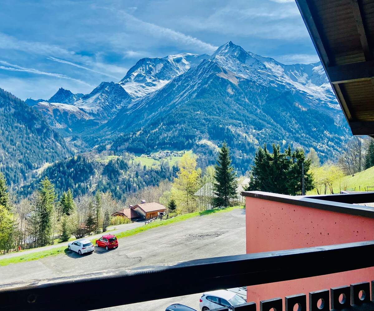 您好,我為您提供面向白朗峰的26平方公尺小天堂,溫馨且設備齊全,可供1至4人入住,位於帶陽臺的小木屋一樓,可欣賞白朗峰的壯麗景色。 冬季距離滑雪場5分鐘(住宅內有免費接駁車),夏季距離小屋前面就有溫水泳池(7月1日至9月1日開放)。 8公里內有村莊/商店,11公里內有聖熱爾韋萊費耶的溫泉浴場和SNCF車站。