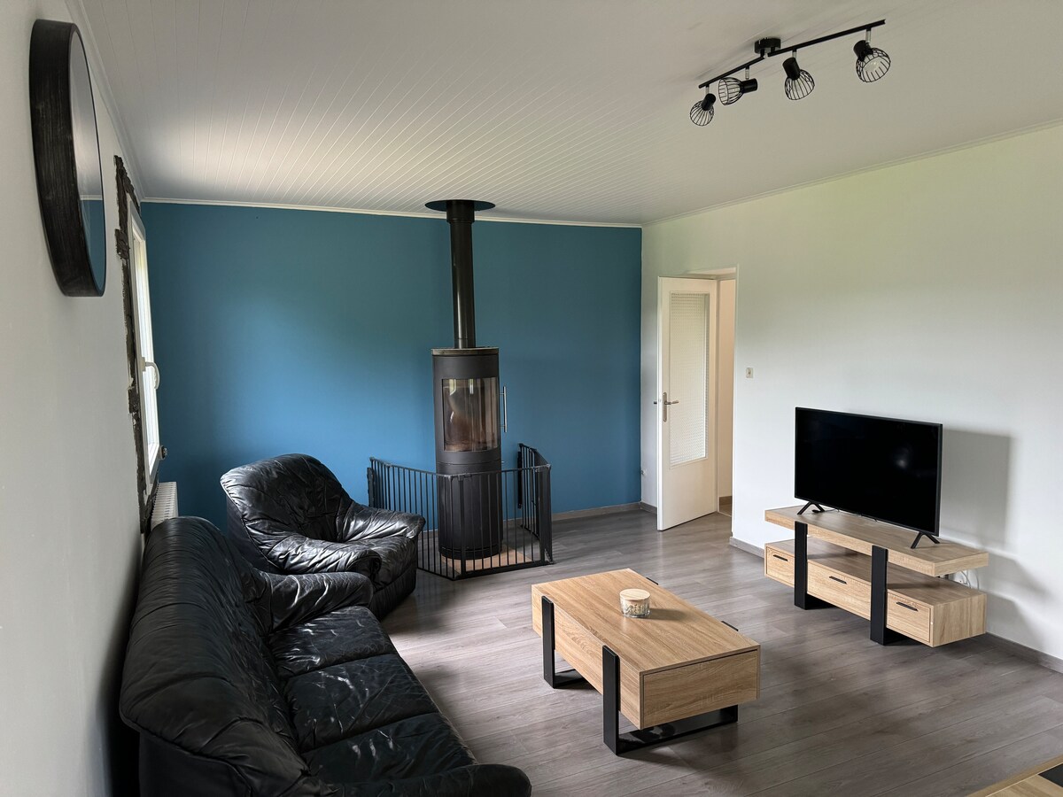 Nous mettons à votre disposition un espace indépendant de 37 m2 dans notre maison. Il est composé d'une entrée spacieuse qui dessert une salle de douche, des sanitaires séparés et la pièce de vie qui vous donne accès à la vue imprenable et calme sur la campagne environnante. Une kitchenette vous permettra de vous restaurer. Lit 140/190 genre Futon. Draps et serviettes de toilette à disposition.
