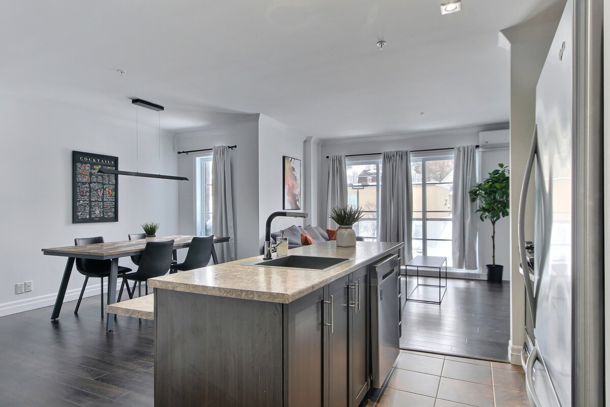 Come and enjoy an unforgettable stay in the heart of the Saint-Roch district in Quebec City. This modern and luxurious condo will charm you as much by its common spaces as by its interior design. ✧️ Indoor Parking included ✧️ Roof terrace with pool, dining area & outdoor fireplace ✧️ BBQ available year-round on the rooftop. ✧️ Fitness room available ✧️ Functional and pleasant apartment ✧️ Fast wifi and work space ✧️ Just a 15 minute walk to Old Quebec