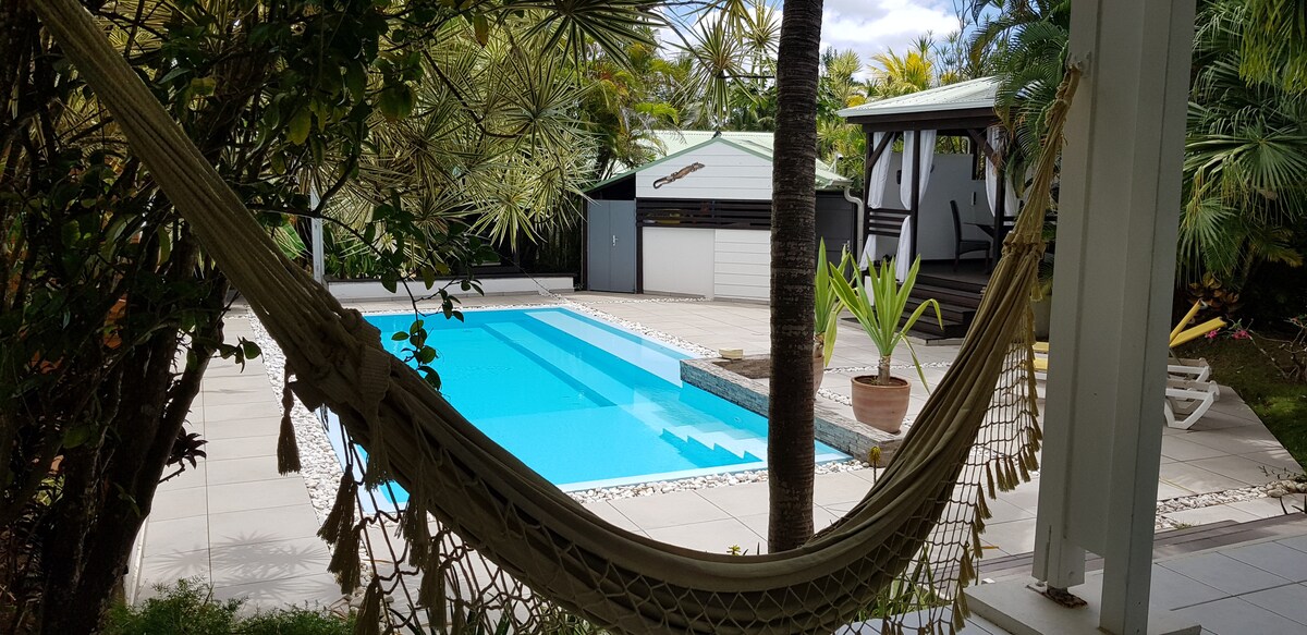 在我們安靜優雅的 kaz 泳池邊,花點時間享受加勒比海的溫柔。位於聖安妮(Sainte Anne),與聖弗朗索瓦(Saint François)接壤,只需幾分鐘即可抵達博瓦約蘭(bois jolan)和萊雷桑克萊爾(raisins clairs)海灘或海勒(helleux)衝浪點。附近 超市、餐廳和 Lolo。舒適的平房配有電視、WiFi、洗衣機、烤肉架……一個友好的平台將歡迎您進入熱帶氛圍。
