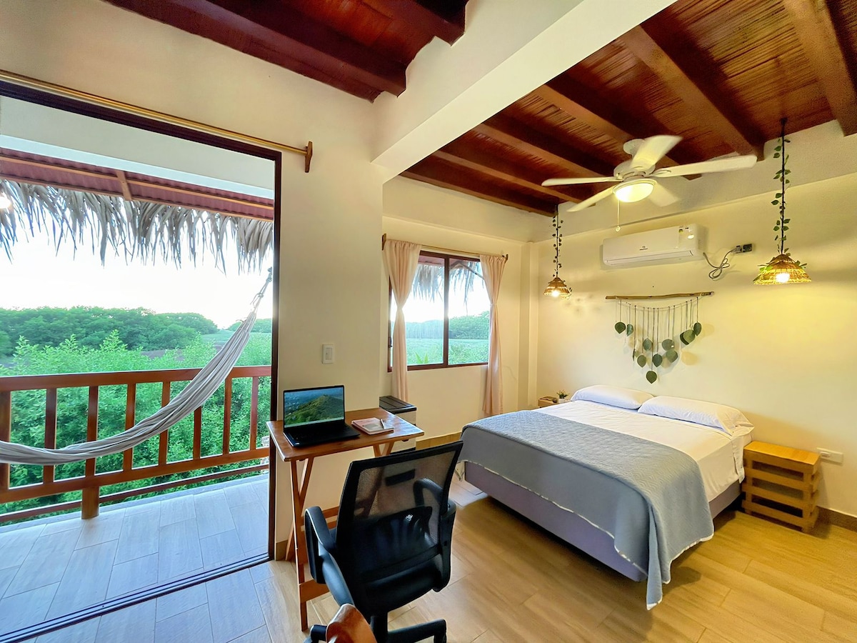 Nuestra mini-suite es un espacio con todo la básico para disfrutar la playa. Tiene una pequeña cocina equipada, un baño con agua caliente, una zona de dormir y una hermosa terraza hacia el jardín. Esta ubicada en un segundo piso y entre los árboles se puede ver el mar. Esta ubicada en una cabaña independiente dentro de nuestro pequeño hostal.