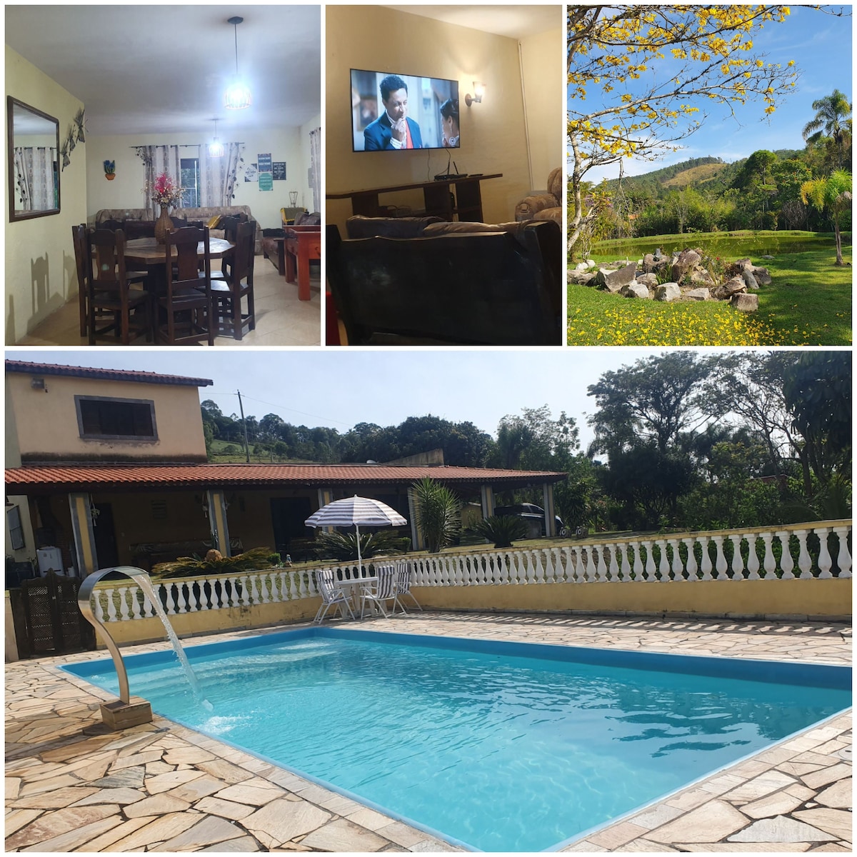 在鳥鳴聲中醒來,享受我們網站上的新鮮空氣,距離Salesópolis旅遊中心僅7分鐘,距離Guarulhos僅1小時30分鐘。 這個空間有3間臥室( 2間套房)、夾層、3間浴室和最多可容納16人的區域,提供泳池、釣魚和湖畔、紅色花園、烤肉、披薩烤箱、壁爐和令人驚豔的綠色鄉村景觀。 配備廚房、WiFi、智慧電視和10輛車的停車位。 簡單、溫馨、充滿魅力。 立即預訂,享受非凡時刻