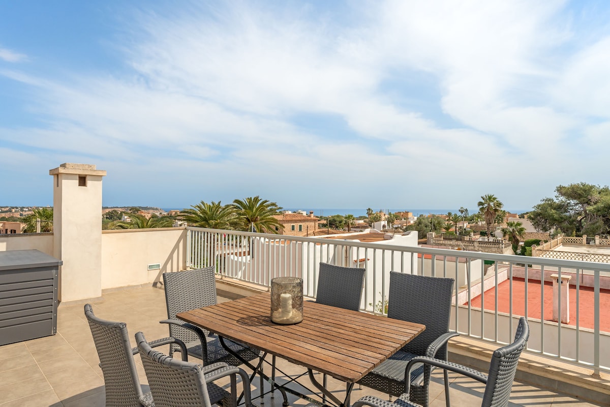 Lovingly renovated Majorcan village house with patio and roof terrace in SantanyiThrough the generous living and dining room with open kitchen on the ground floor you enter the patio, which offers relaxation space on 2 levels. In the rear part of the ground floor there is a cozy double bedroom with water bed, a bathroom and a small single bedroom. Upstairs there is another living room with mini-kitchen, a double and a single bedroom plus a bathroom with shower.