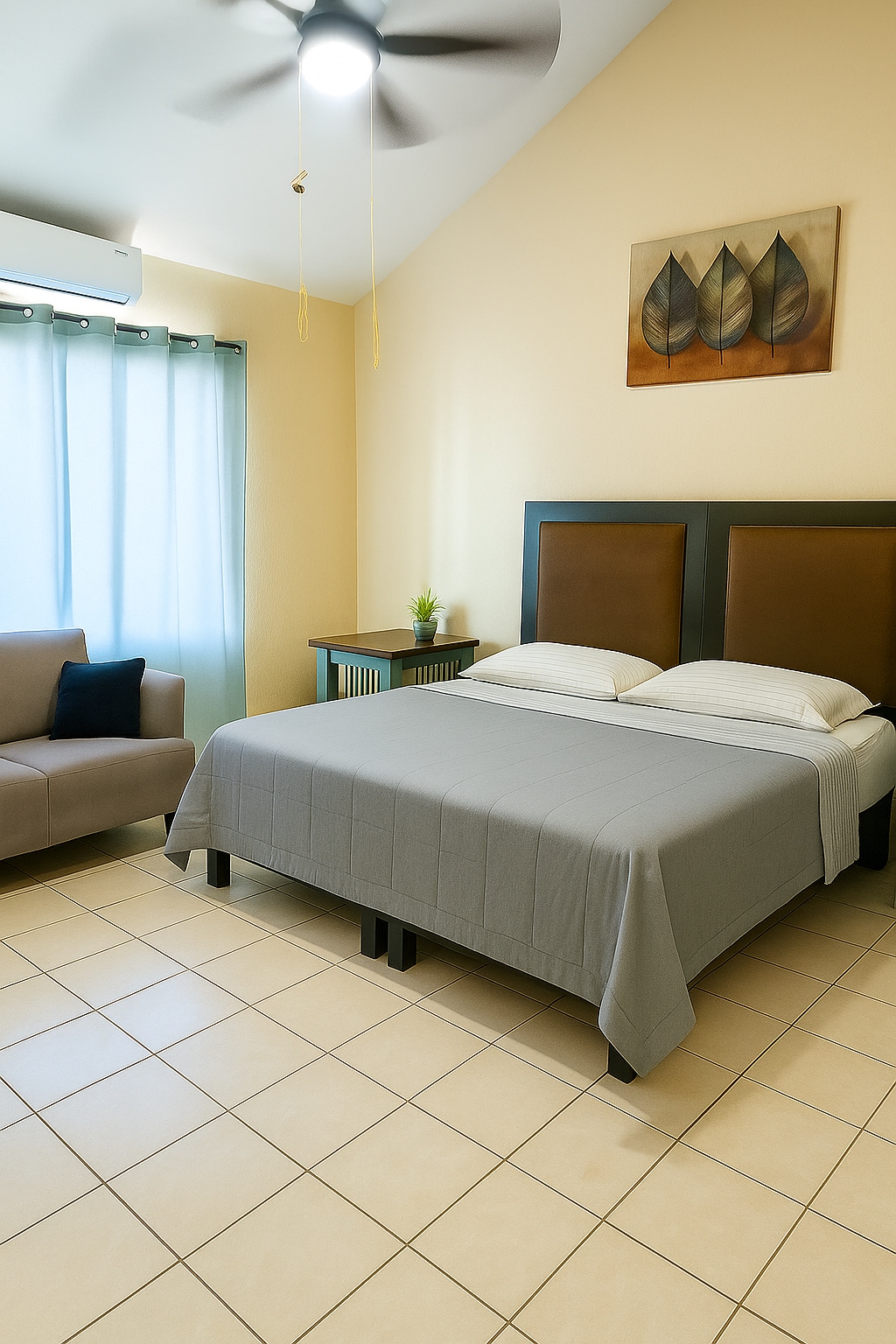 Disfruta de una agradable estancia en éste departamento equipado. Cuenta con cama king size, pantalla Smart TV con Netflix, escritorio ideal para trabajar, peinador, closet y baño completo. Cocina equipada con estufa, microondas, frigobar, cafetera y todos los utensilios necesarios. Se encuentra en una zona muy bien ubicada y segura cerca de centros comerciales, restaurantes y avenidas principales. Perfecto para profesionales, parejas o visitantes que buscan un espacio limpio, cómodo y seguro.