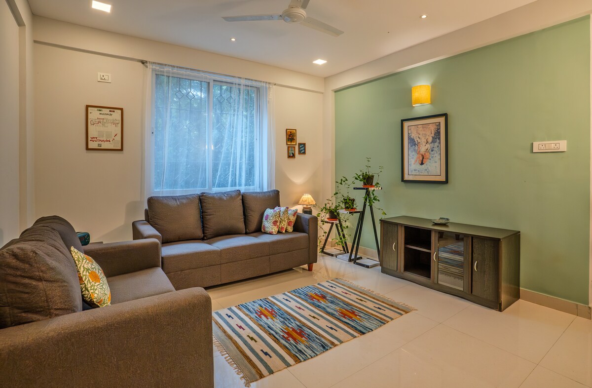 Settled in a calm and tranquil neighbourhood a place surrounded with green with birds chirping away our two bedroom apartment open plan with all basic amenities ranging from Television , Refrigerator , a full fledged kitchen with Wifi to a private terrace at ones disposal for a barbecue night. Supermarkets are a stones throw away with Swiggy and Zomato always at service to clear the cooking blues. we also stick to our house rules very strictly so before booking the place please review them once