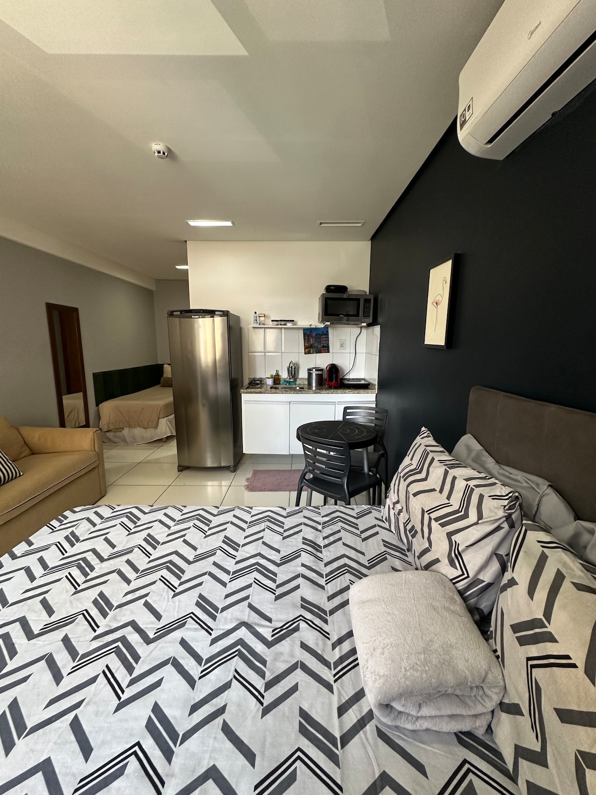 您好,住宿是單間公寓形式,配有雙人床+單人床,此外還有配有Frost Free冰箱、微波爐、咖啡機、智慧電視和幾件物品的廚房,讓您住得舒適。 幾乎所有的設備和家具都是新的。 位於市內主要商業區,距離薩爾瓦多購物中心僅幾公尺。 入住時間: 14小時起。 (如果您需要在下午2點前入住,請查看可訂狀況) 退房時間:中午 * 1個停車位