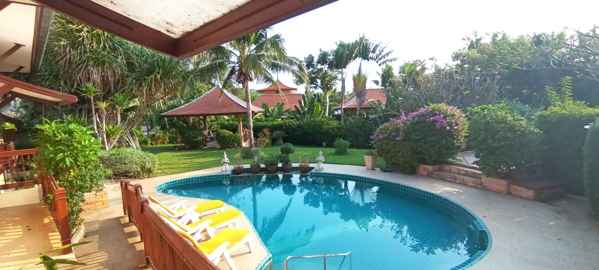 度假別墅可使用空間為480平方公尺,位於小型別墅區內,有自己的私人熱帶花園、1,800平方公尺和私人泳池。 除了主屋外,還有3間平房,每間都有獨立衛浴。 私人健身房、大廳內的撞球桌。 有酒窖和酒廊。 別墅在晚上會亮燈。 房子是泰國巴厘島風格。 臥室有空調、淋浴間和馬桶、洗手台。