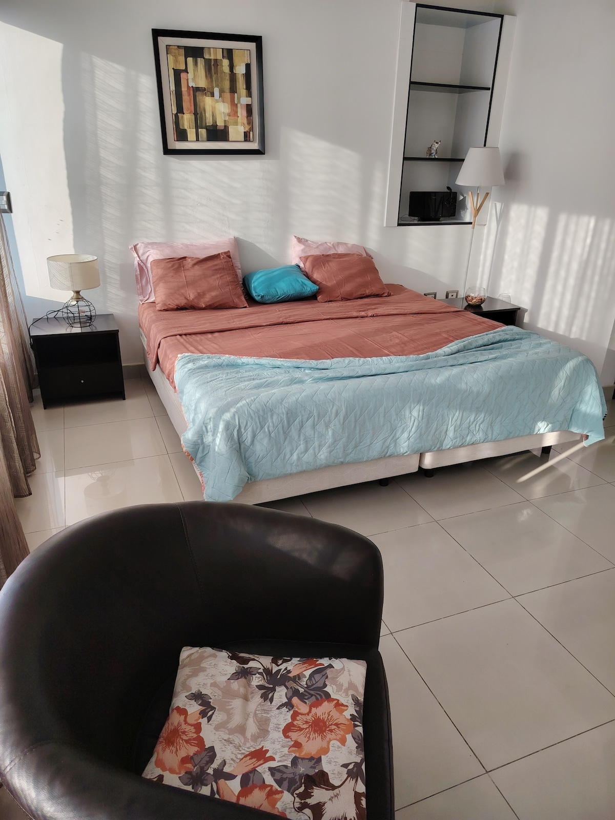 位於二樓的豪華套房(需爬樓梯)。城堡是私人的,有 24 小時全天候的警衛。毗鄰聖馬利諾購物中心。 配有客廳、廚房、臥室、獨立浴室、可收看 Netflix 的智慧電視、WiFi、冰箱、停車位。 進入住宅區受到管制,我們會盡力加快房客的流程;然而,可能需要額外等待幾分鐘。