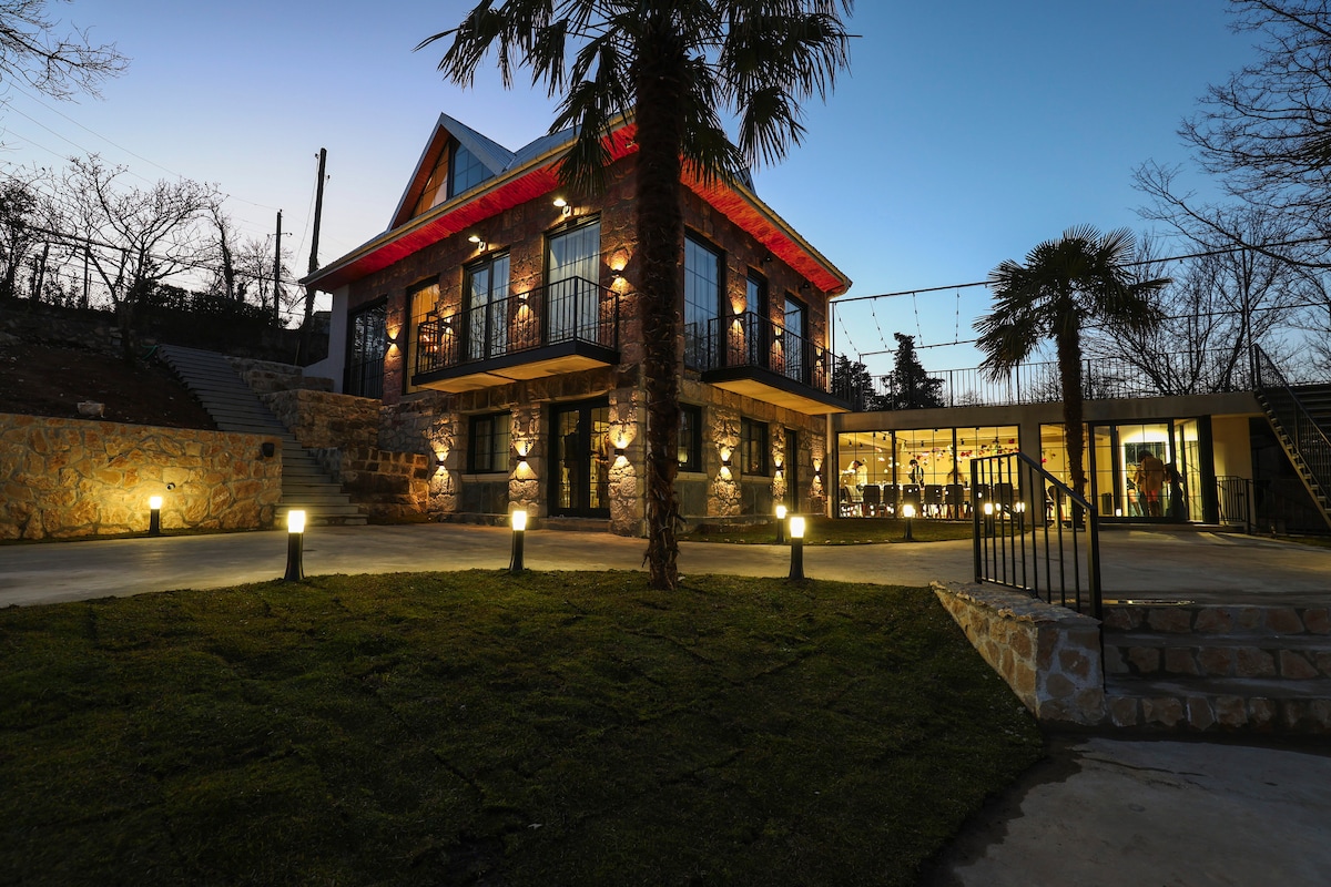 ELEVEN KUTAISI Guest House – A Unique Stay in Kutaisi Escape to a spacious private retreat in Kutaisi’s city center. ELEVEN KUTAISI offers 4 bedrooms, a cozy fireplace lounge, a movie room, and a fully equipped kitchen, perfect for families, groups, and business travelers. Unwind in our lush garden with traditional grapevines, citrus trees, and cozy seating areas. Enjoy a homemade wine experience in our charming atmosphere. Free parking and all major attractions within walking distance!