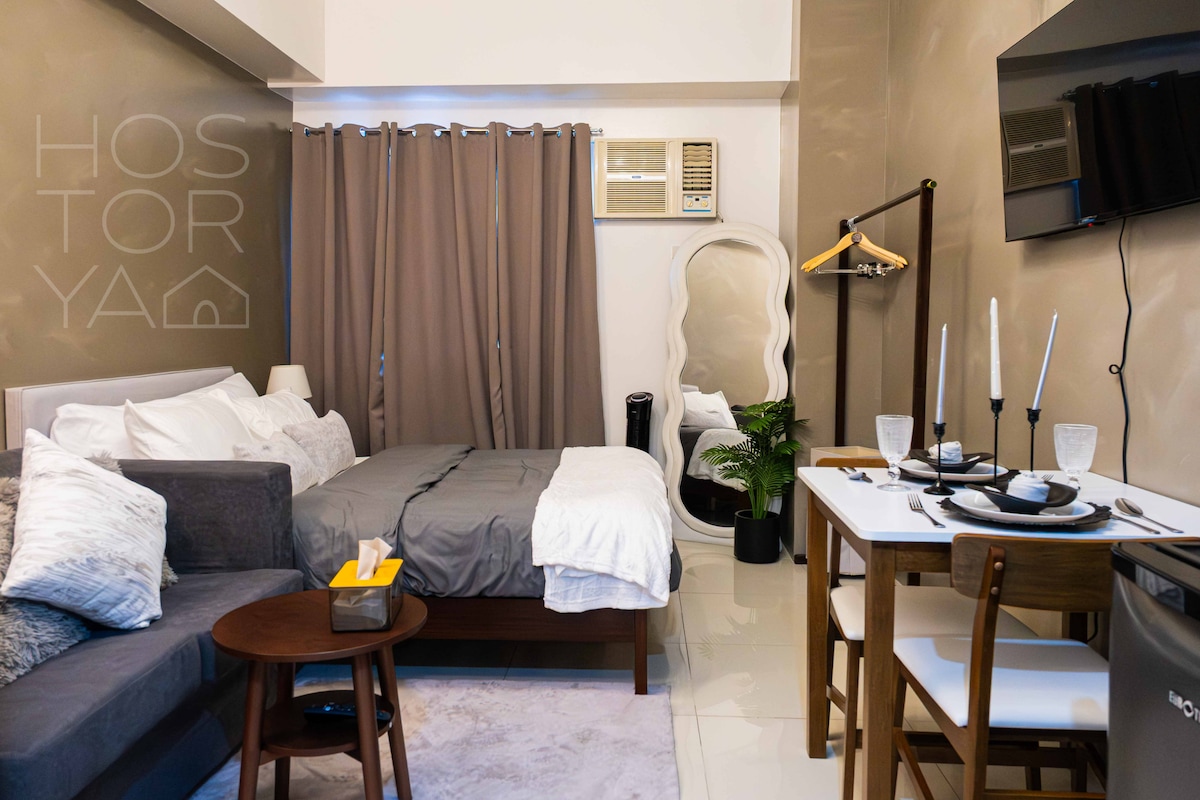 在Ferros Bel-Air Tower Condominium的這間現代熱帶單間公寓中放鬆身心,配有快速網路、50 吋智慧電視(配有Netflix )和設備齊全的廚房。坐落在充滿活力的馬卡蒂市波布拉西翁(Poblacion),新舊交匯,探索繁華的大都會時尚咖啡廳、餐廳和熱門聚會場所。步行即可抵達Powerplant Mall、Century Mall和Makati Avenue ,確保您的所有需求都得到滿足。