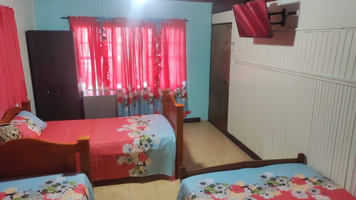 有5間房間,每間房間都有自己的入口、頂部有免費網路、空調、小衣櫃、獨立浴室、淡水、有線電視和冰箱。 3號房最多可容納3人,配有一張雙人牀和一張單人牀。 我們有一個舒適的廚房,您可以使用。 我們位於聖安德烈斯島(San Andrés Isla)的西北部,步行10分鐘( 300米)即可抵達主海灘,步行5分鐘即可抵達市中心。