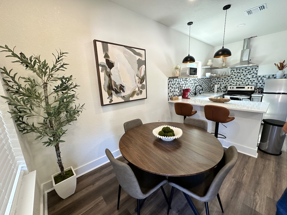 現代小屋藏在迷人的中心街區。獨立客用住房與房東的房子在同一房源。獨特的設計和靈感來自聖安東尼奧,擁有當地藝術和精選書籍的收藏。百老匯外的恆星位置!安靜且私密,但步行即可抵達咖啡店、麵包店、當地書店、中央市場和公園。開車10分鐘即可抵達歷史悠久的珍珠、布雷肯里奇公園、博物館、聖安東尼奧市中心、河濱步道和機場。