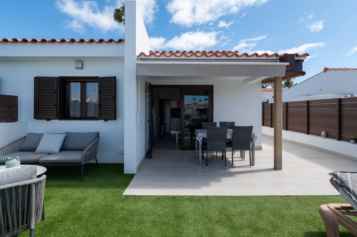 歡迎來到我們位於馬斯帕洛馬斯的獨家平房! 這間寬敞的平房以現代設計和無與倫比的舒適度歡迎您。 明亮的客廳家具品味高雅,設有設備齊全的現代化廚房,包括方便的洗衣機。 您可以準備美味的餐點,並在用餐區域舒適享用。 浴室提供寬敞的步入式淋浴間,非常適合在沙灘上度過一天後放鬆身心。